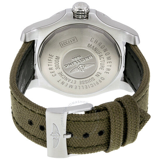 Stainless steel case with a green canvas strap. Uni-directional rotating stainless steel bezel. Yellow dial with luminous silver-tone hands and Arabic numeral hour markers. Minute markers. 1/100th markers around the outer rim. Dial Type: Analog. Luminescent hands and markers. Date display at the 3 o'clock position. Automatic movement with a 40-hour power reserve. Scratch resistant sapphire crystal. Screw locked crown - two gaskets. Solid case back. Case size: 45 mm. Case thickness: 18.40 mm. Round case shape. Band width: 22 mm / 20 mm. Tang clasp. Water resistant at 3000 meters / 10000 feet. Functions: date, hour, minute, second. Luxury watch style. Watch label: Swiss Made. Breitling Avenger II Seawolf Yellow Dial Men's Watch A1733110-I519GCVT.
