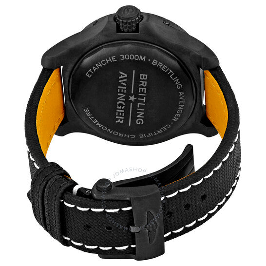 Black titanium case with a black leather strap. Uni-directional rotating black titanium bezel. Black dial with luminous grey hands and Arabic numeral hour markers. Minute markers. 24 hour markers around the outer rim. Dial Type: Analog. Luminescent hands and markers. Date display at the 3 o'clock position. Breitling Calibre 17 Automatic movement, based upon ETA 2824-2, containing 25 Jewels, bitting at 28800 vph, and has a power reserve of approximately 42 hours. Scratch resistant sapphire crystal. Screw locked crown. Solid case back. Round case shape, case size: 45 mm, case thickness: 18.39 mm. Band width: 22 mm / 20 mm. Pushbutton folding- clasp. Water resistant at 3,000 m (10,000 ft). Functions: date, hour, minute, second. Avenger Automatic 45 Seawolf Series. Luxury watch style. Watch label: Swiss Made. Breitling Avenger Seawolf Automatic Chronometer Men's Watch V17319101B1X2.