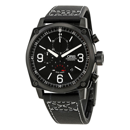 Black PVD stainless steel case with a black leather strap. Fixed black PVD bezel. Black dial with silver-tone hands and index hour markers. Arabic numerals mark the 3, 6 and 12 o'clock positions. Minute markers around the outer rim. Dial Type: Analog. Luminescent hands and markers. Date display between the 4 and 5 o'clock positions. Chronograph - three sub-dials displaying: 60 second, 30 minute and 12 hour. Oris calibre 674, base ETA 7750 automatic movement with a 42-hour power reserve. Scratch resistant sapphire crystal. Screw down crown. Transparent see through case back. Case size: 45 mm. Case thickness: 16 mm. Round case shape. Band width: 24 mm. Band length: 8 inches. Deployment clasp with a push button release. Water resistant at 100 meters / 330 feet. Functions: chronograph, date, hour, minute, second. Casual watch style. Watch label: Swiss Made. Item Variations: 674-7633-4794LS, 01 674 7633 4794-07 5 24 58BFC. Oris Aviation BC4 Chornograph Black Dial Men's Watch 674-7633-4794LS.