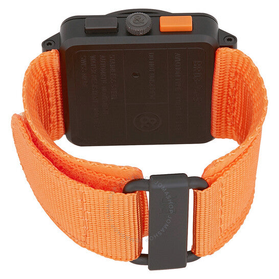 Black PVD stainless steel case with a orange canvas strap. Fixed black PVD stainless steel bezel. Black dial with black sword-shaped hands and index-Arabic numerals hour markers. Minute markers around the outer rim. Dial Type: Analog. Luminescent hands and markers. Date display between 4 and 5 o'clock position. Chronograph - two sub-dials displaying: 60 second and 30 minute. Bell and Ross Calibre BR-CAL.301 Automatic movement, based upon ETA 2894-2, containing 37 Jewels, bitting at 28800 vph, and has a power reserve of approximately 42 hours. Scratch resistant sapphire crystal. Solid case back. Square case shape, case size: 42 mm. Water resistant at 100 meters / 330 feet. Functions: chronograph, date, hour, minute, second. Additional Info: limited edition of 500 pieces. Aviation Series. Luxury watch style. Watch label: Swiss Made. Item Variations: BR0394 O CA, BR0394.O.CA, BR0394OCA. Bell and Ross Aviation Black Dial Automatic Men's Limited Edition Watch BR0394-O-CA.