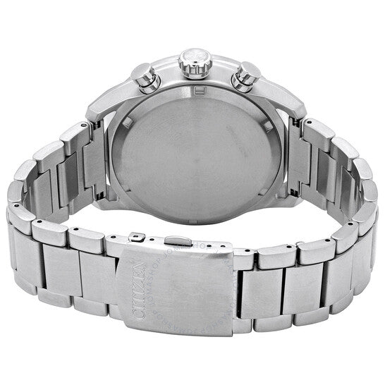 Silver-tone stainless steel case and bracelet. Fixed silver-tone stainless steel bezel. Blue dial with silver-tone hands and index hour markers. Minute markers around the outer rim. Dial Type: Analog. Luminescent hands and markers. Date display between 4 and 5 o'clock position. Chronograph - three sub-dials displaying: 60 second, 60 minute and 24 hour. Citizen Caliber Eco-Drive B620 eco-drive movement. Scratch resistant mineral crystal. Solid case back. Round case shape, case size: 45 mm. Band width: 22 mm. Fold over clasp with a safety release. Water resistant at 100 meters / 330 feet. Functions: chronograph, date, hour, minute, second, solar-powered. Avion Series. Sport watch style. Watch label: Japan Movt. Citizen Avion Chronograph Eco-Drive Blue Dial Men's Watch CA4211-72L.