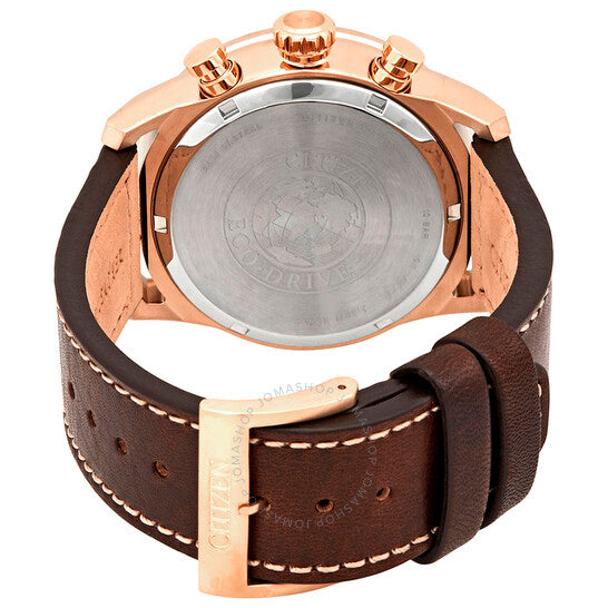Rose gold-tone stainless steel case with a brown leather strap. Fixed rose gold-tone bezel. Blue dial with luminous rose gold-tone hands and Arabic numeral hour markers. Arabic numeral minute markers (at 5 minute intervals). Minute markers around the inner rim. Dial Type: Analog. Luminescent hands and markers. Date display between the 4 and 5 o'clock positions. Chronograph - three sub-dials displaying: 60 second, 60 minute and 24 hours. Citizen caliber Eco-Drive B620 eco-drive movement. Scratch resistant mineral crystal. Solid case back. Round case shape. Case size: 45 mm. Case thickness: 11 mm. Band width: 22 mm. Tang clasp. Water resistant at 100 meters / 330 feet. Functions: chronograph, date, hour, minute, second. Sport watch style. Watch label: Japan Movt. Citizen Avion Chronograph Eco-Drive Blue Dial Men's Watch CA4213-18L.