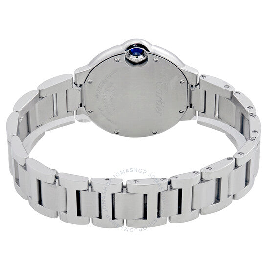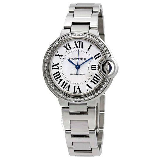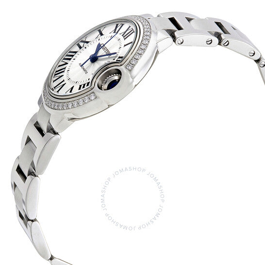 Stainless steel case with a stainless steel bracelet. Fixed stainless steel bezel set with 50 diamonds. Silver flinque sunray dial with blue hands and Roman numeral hour markers. Minute markers around an inner ring. Dial Type: Analog. Automatic movement. Scratch resistant sapphire crystal. Pull / push crown. Solid case back. Round case shape. Case size: 33 mm. Case thickness: 10 mm. Hidden fold over clasp. Water resistant at 30 meters / 100 feet. Functions: hour, minute, second. Additional Info: bezel set with 50 brilliant-cut diamonds (0.63 carats). Crown set with a synthetic cabochon-shaped spinel. Luxury watch style. Watch label: Swiss Made. Cartier Ballon Bleu Silver Flinque Sunray Dial Ladies Watch W4BB0016.