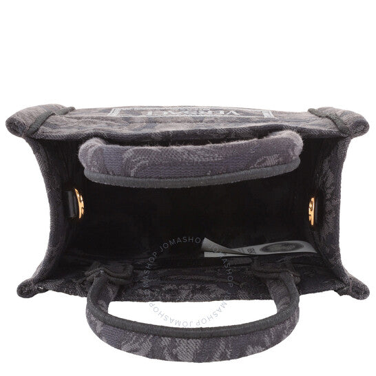 Versace Ladies Tote. SKU: 1015288-1A09741-BLACK+BLACK-VERSACE. Barcode: 8053609379451. Color: Black/Black/Versace/Gold. Size: W 19.5 x H 17 x D 10.5 cm. Versace Barocco Athena Tote Bag. This jacquard Barocco canvas tote bag features rigid top handles, a detachable crossbody strap for versatile carrying options, and is finished with '90s Vintage Logo Versace embroidery. 53% polyamide, 38% cotton, 6% polyester, 3% acrylic. Made in Italy.