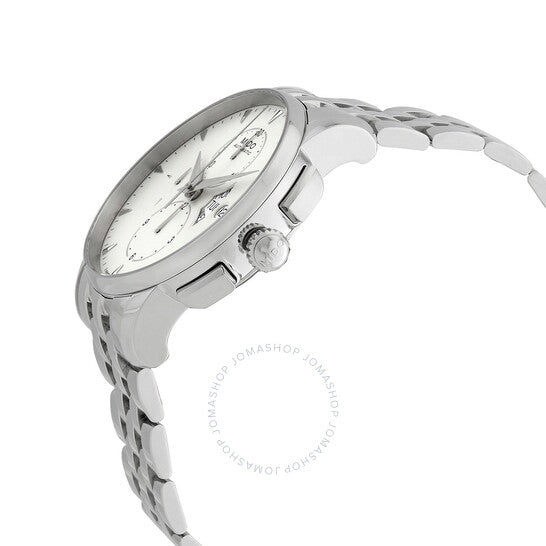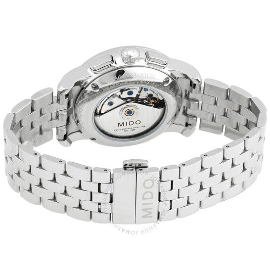Silver-tone stainless steel case and bracelet. Fixed silver-tone stainless steel bezel. Ivory dial with silver-tone hands and index hour markers. Minute markers around the outer rim. Dial Type: Analog. Day of the week and date display at the 3 o'clock position. Chronograph - three sub-dials displaying: small second, 30 minute and 12 hour. Automatic movement. Scratch resistant sapphire crystal. Pull / push crown. Transparent case back. Round case shape, case size: 42 mm. Band width: 22 mm. Fold over clasp with a push button release. Water resistant at 50 meters / 165 feet. Functions: chronograph, day, date, hour, minute, second. Baroncelli Series. Dress watch style. Watch label: Swiss Made. Mido Baroncelli Chronograph Automatic Ivory Dial Men's Watch M860741112.