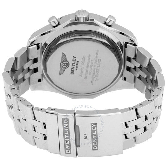 Silver-tone stainless steel case and bracelet. Bi-directional rotating silver-tone stainless steel bezel. Bronze dial with silver-tone hands and index hour markers. Minute markers around the outer rim. Dial Type: Analog. Luminescent hands and markers. Date display between 4 and 5 o'clock position. Chronograph - three sub-dials displaying: 60 second, 15 minute and 6 hour. Breitling Calibre 25 Automatic movement, based upon ETA 2892-A2, containing 21 Jewels, bitting at 28800 vph, and has a power reserve of approximately 42 hours. Scratch resistant sapphire crystal. Screw down crown. Solid case back. Round case shape, case size: 47.8 mm, case thickness: 14.8 mm. Folding clasp. Water resistant at 100 meters / 330 feet. Functions: chronograph, date, hour, minute, small second. Bentley Series. Luxury watch style. Watch label: Swiss Made. Breitling Bentley Chronograph Automatic Bronze Dial Men's Watch A2536412/Q565.990A.