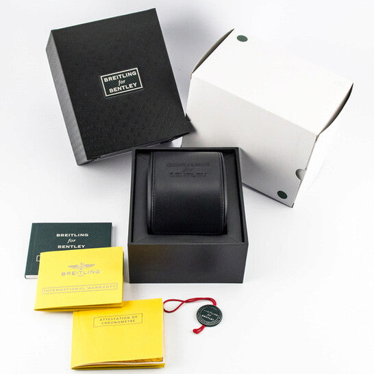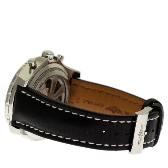 Silver-tone stainless steel case with a black leather strap. Fixed silver-tone stainless steel bezel. Black dial with silver-tone hands and index hour markers. Minute markers around the outer rim. Dial Type: Analog. Luminescent hands and markers. Date display between 4 and 5 o'clock position. Chronograph - three sub-dials displaying: 60 second, 30 minute and 12 hour. Breitling Calibre 04 Automatic movement, based upon Breitling Calibre 01, containing 47 Jewels, bitting at 28000 vph, and has a power reserve of approximately 70 hours. Scratch resistant sapphire crystal. Screw down crown. Transparent case back. Round case shape. Case size: 49 mm. Buckle clasp. Water resistant at 100 meters / 330 feet. Functions: chronograph, date, GMT, second time zone, hour, minute, second, chronometer. Sport watch style. Watch label: Swiss Made. Breitling Bentley Chronograph Automatic Chronometer Black Dial Men's Watch AB043112/BC69.