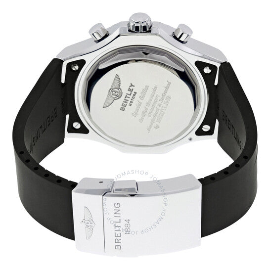 Stainless steel case with a black rubber strap. Bi-directional rotating stainless steel bezel. Bronze dial with luminous silver-tone hands and stick hour markers. An Arabic numeral marks the 12 o'clock position. 24 hour markers. Minute markers. World time cities around the outer rim. Dial Type: Analog. Luminescent hands and markers. Date display appears at the 6 o'clock position. Chronograph - three sub-dials displaying: 60 second, 15 minute and 6 hour. Breitling calibre 47B automatic movement with a 48-hour power reserve. Scratch resistant sapphire crystal. Screw locked crown. Solid case back. Case size: 49 mm. Round case shape. Band width: 30 mm. Deployment clasp with a push button release. Water resistant at 100 meters / 330 feet. Functions: GMT, second time zone, chronograph, date, hour, minute, second. Casual watch style. Watch label: Swiss Made. Breitling Bentley GMT Chronograph Automatic Men's Watch A4736212/Q554.