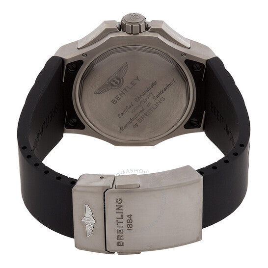 Grey titanium case with a black (bentley ii) rubber strap. Bi-directional rotating grey titanium bezel. Storm silver dial with silver-tone hands and index hour markers. Arabic numeral appears at the 12 o'clock position. Minute markers. 24 hour markers. Minute markers. World time cities around the outer rim. Dial Type: Analog. Luminescent hands and markers. Date display between the 4 and 5 o'clock positions. Chronograph - three sub-dials displaying: 60 second, 30 minute and 12 hour. Breitling Calibre 04 Automatic movement, based upon Breitling Calibre 01, containing 47 Jewels, bitting at 28000 vph, and has a power reserve of approximately 70 hours. Scratch resistant sapphire crystal. Screw locked crown. Solid case back. Round case shape, case size: 45 mm. Deployment clasp. Water resistant at 100 meters / 330 feet. Functions: GMT, second time zone, hour, minute, second, date, chronograph. Bentley Gmt Series. Luxury watch style. Watch label: Swiss Made. Breitling Bentley GMT Chronograph Automatic Men's Watch EB043335/G801.
