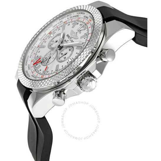 Stainless steel case with a black rubber strap. Silver dial with luminous hands and index hour markers. GMT scale around the outer rim. Date display appears at the 6 o'clock position. Self-winding automatic movement. Scratch resistant sapphire crystal. Case diameter: 49 mm. Deployment clasp. Water resistant at 100 meters/ 330 feet. Functions: hours, minutes, seconds, calendar, GMT. Breitling Bentley GMT Silver Dial Men's Watch A4736212-G657BKRD.