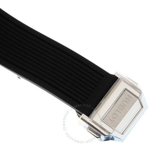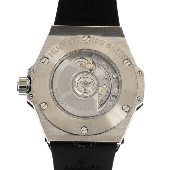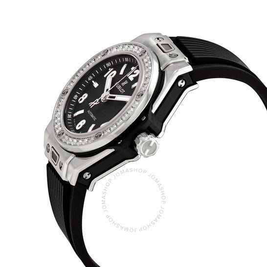 Stainless steel case with a black rubber strap. Fixed stainless steel bezel set with 36 diamonds. Black dial with luminous silver-tone hands and alternating Arabic numeral and index hour markers. Arabic numeral minute markers (at 5 minute intervals). Minute markers around the outer rim. Dial Type: Analog. Luminescent hands and markers. Date display at the 3 o'clock position. Hublot calibre HUB1120 automatic movement, containing 18 Jewels, composed of 65 parts, bitting at 28800 vph, and has a power reserve of approximately 40 hours. Scratch resistant sapphire crystal. Transparent case back. Round case shape. Case size: 33 mm. Deployment clasp with a push button release. Water resistant at 100 meters / 330 feet. Functions: date, hour, minute, second. Additional Info: original box, manual (complete accessories). Big Bang Series. Luxury watch style. Watch label: Swiss Made. Hublot Big Bang Automatic Diamond Black Dial Ladies Watch 485.SX.1170.RX.1204.