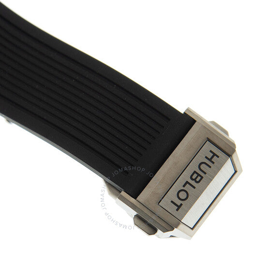 Grey titanium case with a black rubber strap. Fixed grey titanium bezel showing 12 hour markings. Digital dial with luminous silver-tone hands and index hour markers. Arabic numeral minute markers (at 5 minute intervals). Minute markers around the outer rim. Dial Type: digital. Luminescent hands and markers. Two sub-dials displaying: 60 second and 60 minute. Power reserve indicator. Qualcomm® snapdragon wear⢠3100 quartz movement with a 24-hour power reserve. Scratch resistant sapphire crystal. Screw down crown. Solid case back. Round case shape. Case size: 42 mm. Deployment clasp. Water resistant at 30 meters / 100 feet. Functions: the big bang e is powered with wear os by google. Big Bang Series. Sport watch style. Watch label: Swiss Made. Hublot Big Bang E Titanium Digital Men's Watch 440.NX.1100.RX.