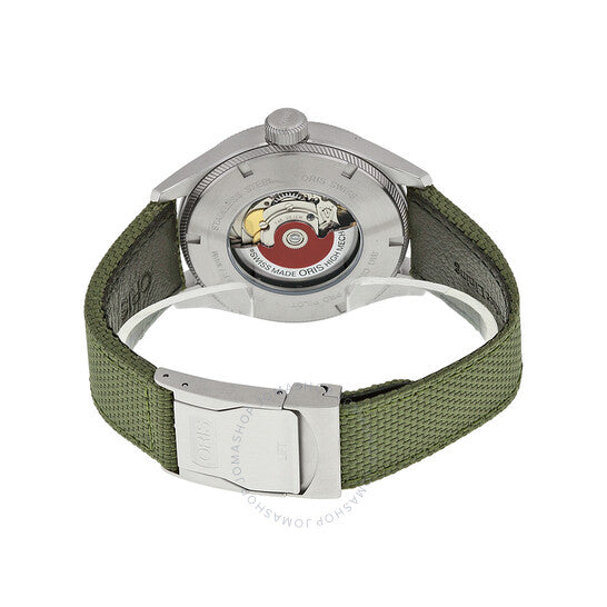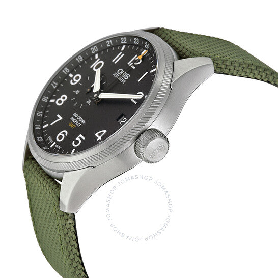 Silver-tone stainless steel case with a olive green textile strap. Fixed silver-tone stainless steel bezel. Black dial with luminous silver-tone hands and Arabic numeral hour markers. Minute markers. 24 hour markers around the outer rim. Dial Type: Analog. Luminescent hands. Date display at the 3 o'clock position. Seconds sub-dial at the 9 o'clock position subdials. Oris Calibre 748 Automatic movement, based upon Sellita SW220-1, containing 28 Jewels, bitting at 28800 vph, and has a power reserve of approximately 38 hours. Scratch resistant sapphire crystal. Screw down crown. Skeleton case back. Round case shape, case size: 45 mm, case thickness: 13 mm. Band width: 22 mm, band length: 8.5 inches. Lift clasp. Water resistant at 100 meters / 330 feet. Functions: GMT, date, hour, minute, second. Big Crown Propilot Series. Pilot watch style. Watch label: Swiss Made. Oris Big Crown Pro Pilot Automatic Men's Watch 748-7710-4164GRFS.
