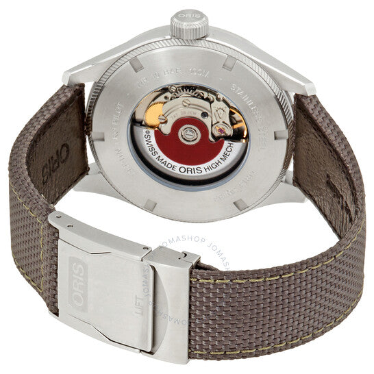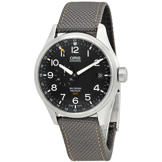 Silver-tone stainless steel case with a grey fabric strap. Fixed silver-tone stainless steel bezel. Black dial with luminous silver-tone hands and Arabic numeral hour markers. Minute markers. 24 hour markers around the outer rim. Dial Type: Analog. Luminescent hands and markers. Date display at the 3 o'clock position. Small second subdial. Oris Calibre 748 Automatic movement, based upon Sellita SW220-1, containing 28 Jewels, bitting at 28800 vph, and has a power reserve of approximately 38 hours. Scratch resistant sapphire crystal. Screw down crown. Transparent case back. Round case shape, case size: 45 mm. Band width: 22 mm. Deployment clasp. Water resistant at 100 meters / 330 feet. Functions: big date, GMT, second time zone, hour, minute, small second. Big Crown Propilot Series. Pilot watch style. Watch label: Swiss Made. Oris Big Crown ProPilot Automatic Black Dial Men's Watch 01 748 7710 4164-07 5 22 17FC.