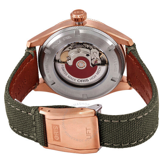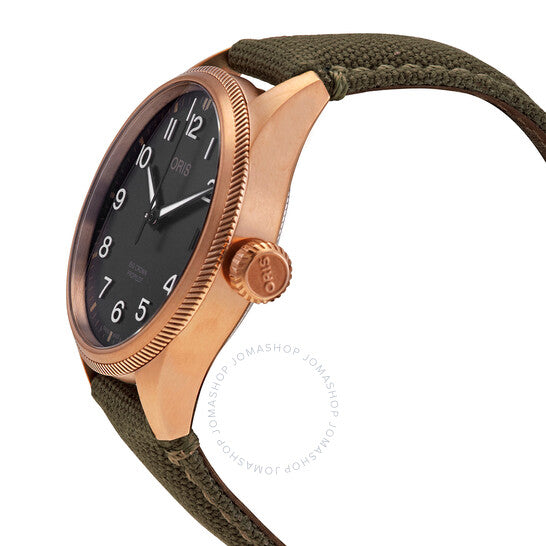 Bronze case with a olive green textile strap. Fixed fluted bronze bezel. Black dial with luminous black hands and Arabic numeral hour markers. Minute markers around the outer rim. Dial Type: Analog. Luminescent hands and markers. Date display at the 3 o'clock position. Oris Calibre 751 Automatic movement, based upon SW 220-1, containing 26 Jewels, bitting at 28800 vph, and has a power reserve of approximately 38 hours. Scratch resistant sapphire crystal. Screw down crown. Transparent case back. Round case shape, case size: 41 mm. Band width: 19 mm. Folding clasp. Water resistant at 100 meters / 330 feet. Functions: date, hour, minute, second. Big Crown Propilot Series. Casual watch style. Watch label: Swiss Made. Oris Big Crown Propilot Automatic Black Dial Men's Watch 01 751 7761 3164-07 3 2003BRLC.