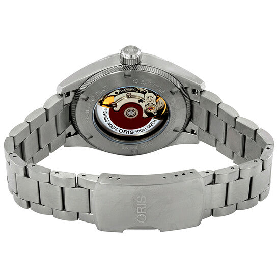 Silver-tone stainless steel case and bracelet. Fixed silver-tone stainless steel bezel. Blue dial with luminous silver-tone hands and Arabic numeral hour markers. Minute markers around the outer rim. Dial Type: Analog. Luminescent hands and markers. Date display at the 3 o'clock position. Oris Calibre 751, base SW 220-1 Automatic movement, based upon SW 220-1, containing 26 Jewels, bitting at 28800 vph, and has a power reserve of approximately 38 hours. Scratch resistant sapphire crystal. Screw down crown. Transparent case back. Round case shape, case size: 41 mm, case thickness: 12.2 mm. Band width: 20 mm. Fold over clasp. Water resistant at 100 meters / 330 feet. Functions: date, hour, minute, second. Big Crown Propilot Series. Casual watch style. Watch label: Swiss Made. Oris Big Crown ProPilot Automatic Blue Dial Men's Watch 01 751 7697 4065-07 8 20 19.