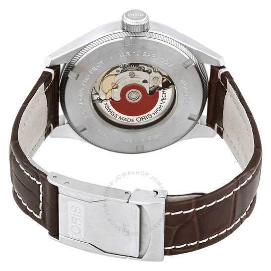 Stainless steel case with a dark brown (croco-embossed) leather strap. Fixed stainless steel bezel. Blue dial with luminous silver-tone hands and Arabic numeral hour markers. Minute markers around the outer rim. Dial Type: Analog. Luminescent hands and markers. Day of the week and date display at the 3 o'clock position. Oris calibre 752, base SW 220-1 automatic movement, based upon SW 220-1, containing 26 Jewels, bitting at 28800 vph, and has a power reserve of approximately 38 hours. Scratch resistant sapphire crystal. Screw down crown. Transparent case back. Round case shape. Case size: 45 mm. Band width: 22 mm. Fold over clasp. Water resistant at 100 meters / 330 feet. Functions: date, day, hour, minute, second. Big Crown Propilot Series. Pilot watch style. Watch label: Swiss Made. Oris Big Crown Propilot Automatic Blue Dial Men's Watch 01 752 7698 4065-07 1 22 72FC.