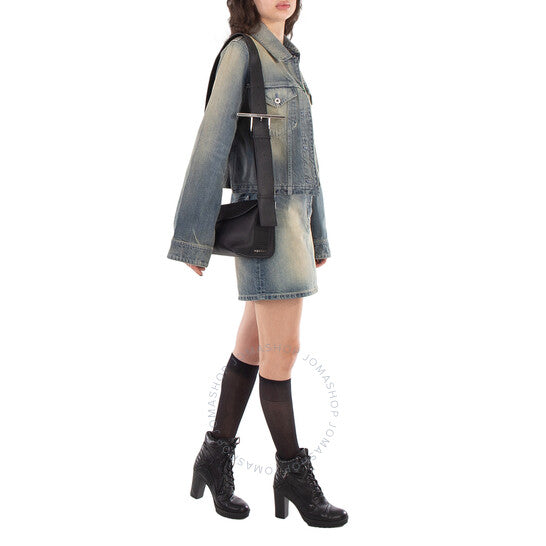 Alexander McQueen Ladies Crossbody. SKU: 808521 1VDBF 1000. Barcode: 3666582720711. Color: Black/Silver. Size: Length 20 x Height 13-16 x Depth 0.5-12 cm / 7.8 x 5.1-6.2 x 0.1-4.7 inches. Alexander McQueen Black/Silver Ladies T-bar Sling Bag. The T-Bar Sling bag features an asymmetrical design, handcrafted from a single piece of black textured calf leather. It can be worn crossbody with the adjustable leather strap for versatility. The bag is detailed with an oversized statement buckle in silver-tone metal, engraved with the McQueen logo, and includes McQueen metal lettering along with an external metal D-ring on the side. It offers both magnetic and zip fastening for secure closure, with one central zip compartment that includes a card slot and metal D-ring. The interior is lined with suede for a luxurious finish. Material: Calf Leather. Made in Italy.