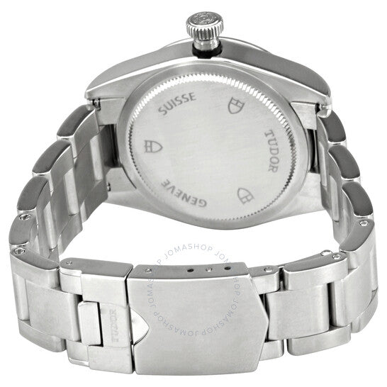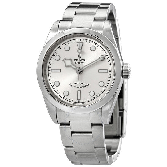 Stainless steel case with a stainless steel bracelet. Fixed stainless steel bezel. Silver dial with luminous hands and dot hour markers. Minute markers around the outer rim. Dial Type: Analog. Luminescent hands and markers. Tudor calibre T600 automatic movement with a 38-hour power reserve. Scratch resistant sapphire crystal. Screw down crown. Solid case back. Round case shape. Case size: 32 mm. Fold over clasp with a safety release. Water resistant at 150 meters / 500 feet. Functions: hour, minute, second. Black Bay 32 Series. Luxury watch style. Watch label: Swiss Made. Tudor Black Bay 32 Automatic Silver Dial Ladies Watch M79580-0007.