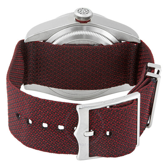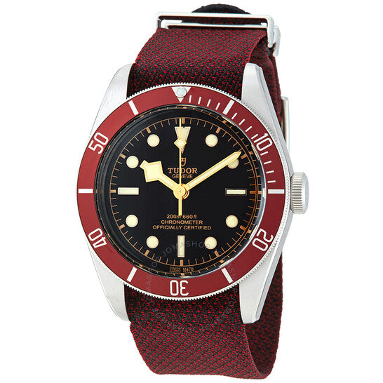Stainless steel case with a red fabric strap. Uni-directional rotating stainless steel bezel with a red aluminium ring. Black dial with gold-tone snowflake hands and dot hour markers. Minute markers around the outer rim. Dial Type: Analog. Luminescent hands and markers. Tudor calibre MT5602 automatic movement with a 70-hour power reserve. Scratch resistant sapphire crystal. Screw down crown. Solid case back. Round case shape. Case size: 41 mm. Band width: 20 mm. Tang clasp. Water resistant at 200 meters / 660 feet. Functions: hour, minute, second, chronometer. Luxury watch style. Watch label: Swiss Made. Tudor Black Bay Automatic Chronometer Black Dial Men's Watch M79230R-0009.