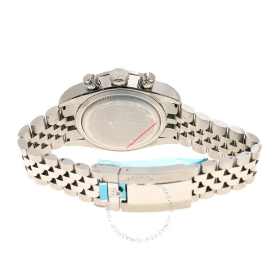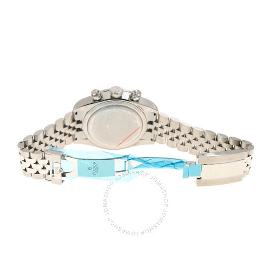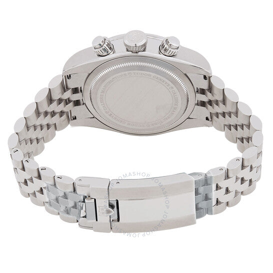 Silver-tone stainless steel case and bracelet. Fixed silver-tone stainless steel with an inlaid blue aluminium ring showing tachymeter markings bezel. Blue dial with silver-tone hands and index hour markers. Minute markers around the outer rim. Dial Type: Analog. Luminescent hands and markers. Date display at the 6 o'clock position. Chronograph - two sub-dials displaying: 60 second and 45 minute. Tudor Calibre MT5813 Automatic movement, based upon Breitling B01, containing 47 Jewels, bitting at 28800 vph, and has a power reserve of approximately 70 hours. Scratch resistant sapphire crystal. Screw down crown. Solid case back. Round case shape, case size: 41 mm, case thickness: 14.4 mm. Band width: 22 mm. Fold over clasp with a safety release. Water resistant at 200 meters / 660 feet. Functions: chronograph, column wheel, hour, minute, small second, power reserve indicator, chronometer. Black Bay Chrono Series. Luxury watch style. Watch label: Swiss Made. Tudor Black Bay Chrono Automati