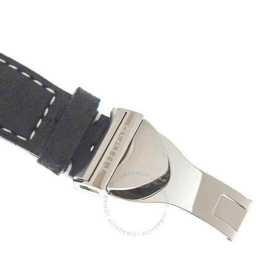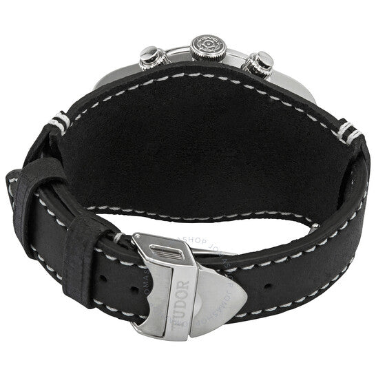 Stainless steel case with a black leather (cuff) strap. Fixed stainless steel bezel with an inlaid black aluminium ring showing units per hour markings. White dial with luminous silver-tone hands and index hour markers. Minute markers around the outer rim. Dial Type: Analog. Luminescent hands and markers. Date display at the 6 o'clock position. Chronograph - two sub-dials displaying: 60 second and 45 minute. Tudor calibre MT5813 automatic movement, based upon Breitling B01, containing 47 Jewels, bitting at 28800 vph, and has a power reserve of approximately 70 hours. Scratch resistant sapphire crystal. Screw down crown. Solid case back. Round case shape. Case size: 41 mm. Case thickness: 15 mm. Fold over clasp. Water resistant at 200 meters / 660 feet. Functions: chronograph, column wheel, hour, minute, small second, power reserve indicator, chronometer. Black Bay Chrono Series. Luxury watch style. Watch label: Swiss Made. Tudor Black Bay Chrono Chronograph White Dial Men's Watch M79360N-0006.
