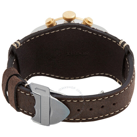 Polished and satin finish silver-tone stainless steel case with a brown leather strap. Fixed yellow gold and matt black anodised aluminium disc bezel. Yellow gold dial with gold-tone hands and index hour markers. Tachymeter. Dial Type: Analog. Luminescent hands and markers. Date display at the 6 o'clock position. Tudor Calibre MT5813 (COSC) automatic movement with a 70-hour power reserve. Scratch resistant sapphire crystal. Screw down crown. Solid case back. Round case shape, case size: 41 mm. Folding clasp. Water resistant at 200 meters / 660 feet. Functions: chronograph, date, hour, minute, second. Black Bay Chrono S&g Series. Luxury watch style. Watch label: Swiss Made. Tudor Black Bay Chrono S G Chronograph Automatic Men's Watch M79363N-0008.