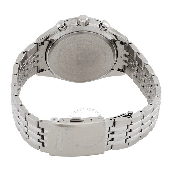 Silver-tone stainless steel case and bracelet. Fixed silver-tone stainless steel bezel. Black dial with silver-tone hands and index hour markers. Dial Type: Analog. Luminescent hands and markers. Date display at the 3 o'clock position. Chronograph - three sub-dials displaying: 60 second, 30 minute and 1/10th of a second. Citizen Caliber Eco-Drive B612 eco-drive movement. Scratch resistant sapphire crystal. Solid case back. Round case shape, case size: 40mm. Water resistant at 100 meters / 330 feet. Functions: chronograph, date, hour, minute, second, solar-powered. Sport watch style. Watch label: Japan Movt. Citizen Black Dial Watch CA0450-57E.