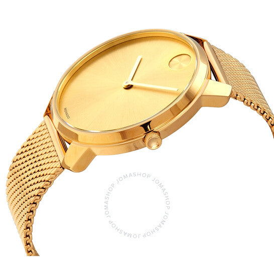 Yellow gold ion-plated stainless steel case with a yellow gold ion-plated stainless steel mesh bracelet. Fixed yellow gold ion-plated bezel. Gold dial with yellow gold-tone hands. No markers. The Movado dot appears at the 12 o'clock position. Dial Type: Analog. Quartz movement. Scratch resistant K1 crystal. Pull / push crown. Solid case back. Round case shape. Case size: 42 mm. Case thickness: 6.7 mm. Band width: 21 mm. Slide through clasp. Water resistant at 30 meters / 100 feet. Functions: hour, minute. Casual watch style. Watch label: Swiss Made. Movado Bold Quartz Gold Dial Yellow Gold Ion-plated Men's Watch 3600588.