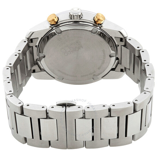 Silver-tone stainless steel case and bracelet. Fixed silver-tone stainless steel bezel. Gold dial with gold-tone hands and index hour markers. Minute markers around the outer rim. Dial Type: Analog. Luminescent hands and markers. Date display at the 4 o'clock position. Three sub-dials displaying: 60 second, 30 minute and day. Quartz movement. Scratch resistant K1 crystal. Pull / push crown. Solid case back. Round case shape, case size: 44 mm. Deployment clasp. Water resistant at 50 meters / 165 feet. Functions: chronograph, date, day, hour, minute, second. Bold Verso Series. Sport watch style. Watch label: Swiss Made. Movado Bold Verso Chronograph Quartz Gold Dial Men's Watch 3600907.
