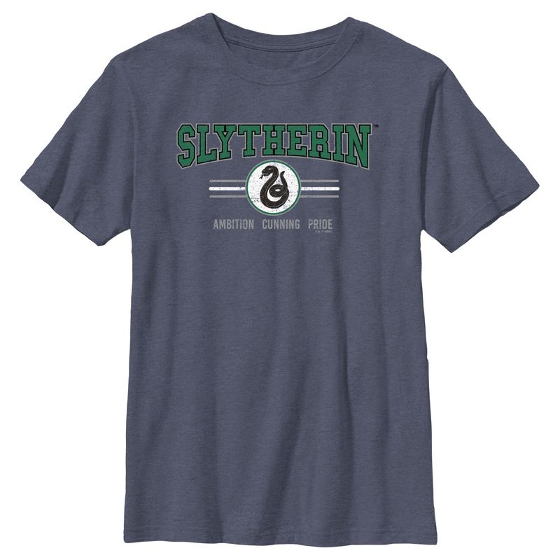 - Strut your stuff with this stylish new boys' t-shirt that is perfect for every occasion! Featuring a distressed graphic of the Slytherin snake printed above the words: "Ambition Cunning Pride."