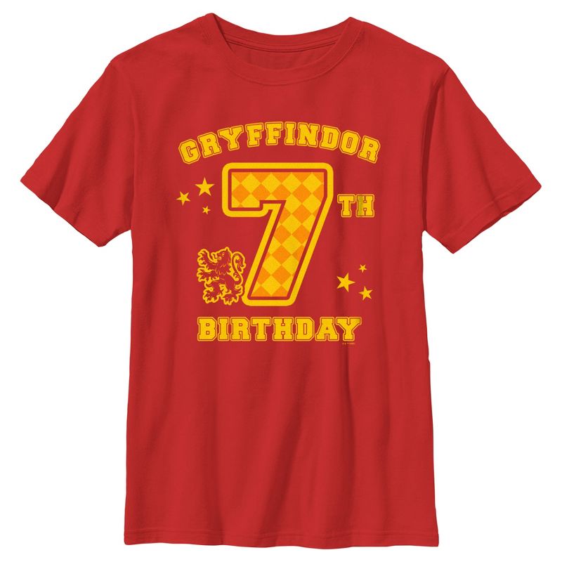 - Strut your stuff with this stylish new boys' t-shirt that is perfect for birthdays! Featuring the iconic Gryffindor lion and "7th birthday" printed in yellow lettering across the front.