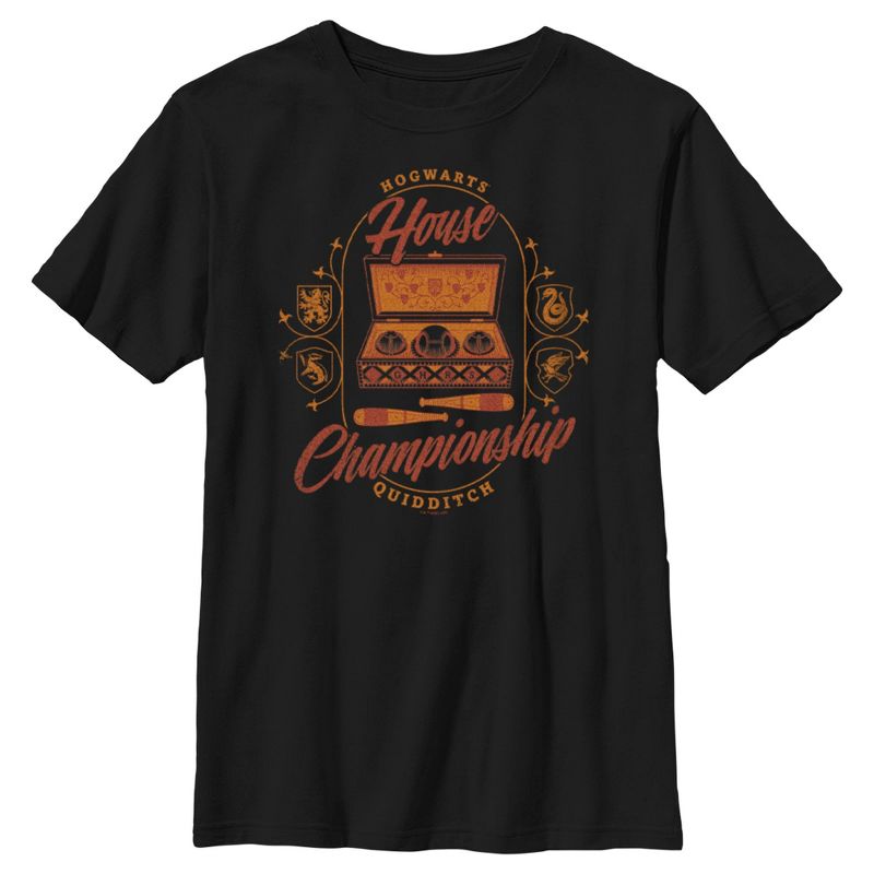 Unlock magical secrets hiding in the closet under the stairs with this officially licensed Harry Potter Hogwarts House Championship Boys' Graphic T-Shirt! Head back to Hogwarts in style with this cool boys' classic tee that shows off Quidditch gear like a Quaffle, two Bludgers, and Beater's bats beneath the distressed red text "Hogwarts House Championship Quidditch" across the front! And, just remember, the spell is Wing-gar-dium Levi-o-sa and NOT Wingardium Leviosa!