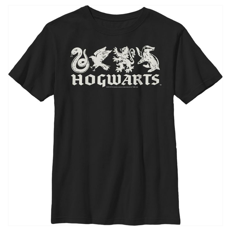 - Strut your stuff with this stylish new everyday Boys' T-Shirt that is perfect for every occasion! Featuring the Hogwarts houses' mascots from Slytherin, Ravenclaw, Gryffindor, and Hufflepuff.