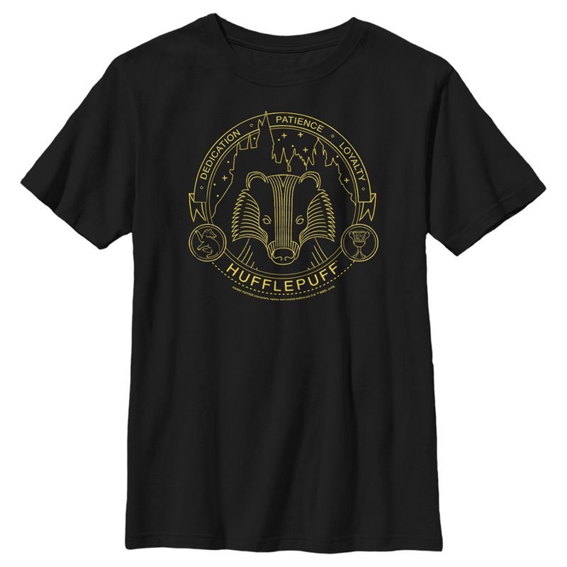 - Strut your stuff with this stylish new everyday boys' t-shirt that is perfect for every occasion! Featuring the text: "Dedication, Patience, Loyalty" with Hufflepuff's mascot, the badger across the front.
