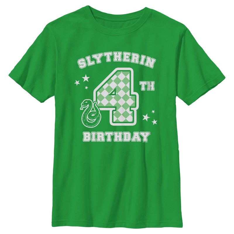 - Strut your stuff with this stylish new boys' t-shirt that is perfect for birthdays! Featuring the iconic Slytherin snake and "4th birthday" printed in white and green lettering across the front.