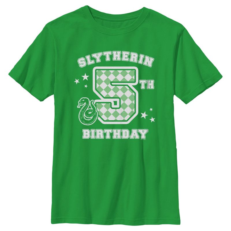 - Strut your stuff with this stylish new boys' t-shirt that is perfect for birthdays! Featuring the iconic Slytherin snake and "5th birthday" printed in white and green lettering across the front.