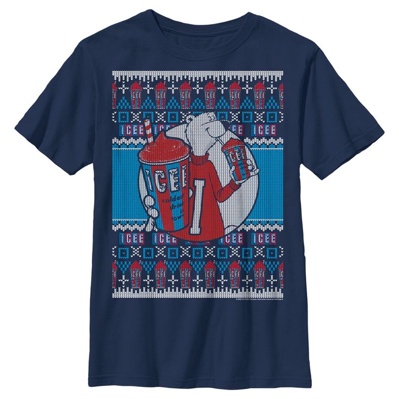 Summer is fast approaching, and there's no better way to cool down than with a refreshing ICEE drink and this officially licensed ICEE Bear Ugly Sweater Boys' Tee! This ugly sweater design features ICEE Bear enjoying a cold ICEE and offering you one, as well. Chill out in this new graphic tee, or grab one for a friend, but don't forget to stay hydrated and keep it cool this season!