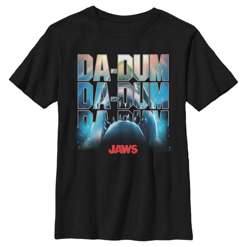 You're going to need a bigger boat for the Jaws Da-Dum Da-Dum Boys' Tee! Steven Spielberg's 1975 blockbuster film is celebrated with this retro Jaws tee that features a graphic of Jaws showing his teeth with the iconic: "Da-Dum Da-Dum" music, perfect for any fan of Martin Brody, Quint, or the man-eating great white shark that is terrifying the citizens of Amity Island this summer!