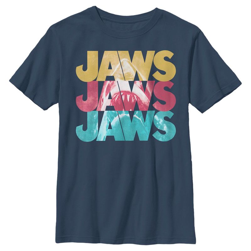- Strut your stuff with this stylish new everyday Boys' T-Shirt that is perfect for every occasion! Featuring a yellow, red, and blue Jaws logo and a graphic of a terrifying shark in the background.
