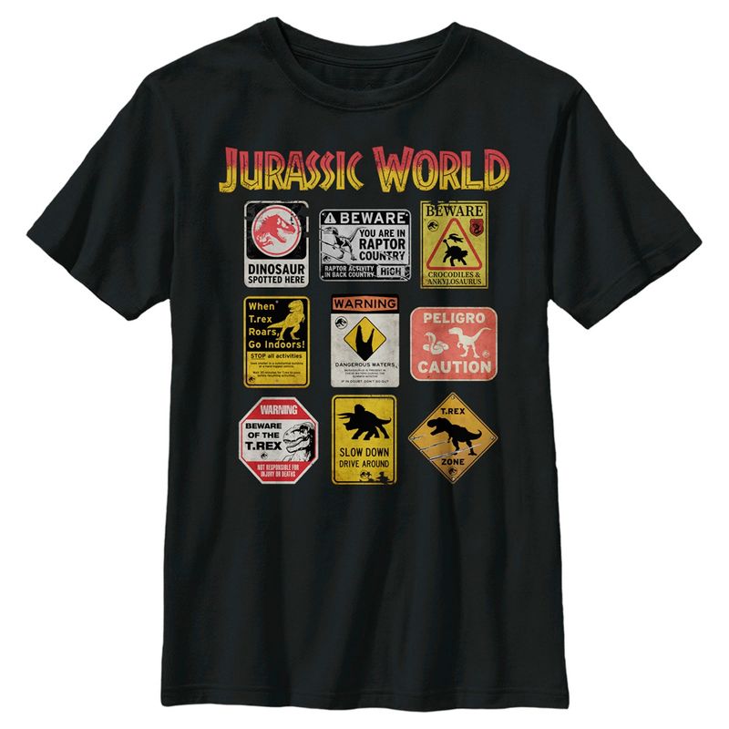 - Show your love for all things dinosaurs with this fun new boys' graphic t-shirt that is perfect for every occasion. Featuring warning signs for all the dangerous dinosaurs across the front of this tee!