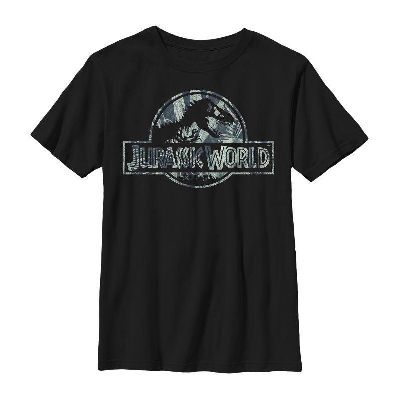 Heading to Jurassic World? Grab some friends and the Jurassic World Grayscale Tropical T Rex Logo Boys' T-Shirt, and let's hope you don't come face to face with a velociraptor! A grayscale Jurassic World logo is printed in a tropical style on this boys' Jurassic World shirt for fans of the thrilling dinosaur series.