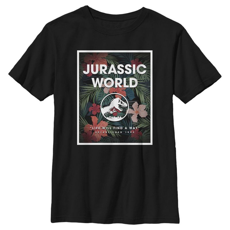 You may not make it out of Jurassic Park in one piece, but at least you got this awesome officially licensed Jurassic World: Fallen Kingdom Tropical Poster Boys' Graphic T-Shirt! This cool design reads "Jurassic World" and the quote: "Life Will Find a Way" in bold white text and the iconic T. Rex skeleton across the front. Life finds a way… especially when it comes to getting your hands on this awesome Jurassic World garment.