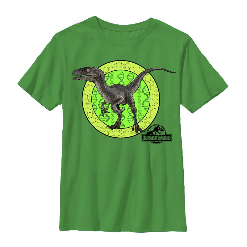 Get to know one of the most frightening dinosaurs on a deeper level with the Jurassic World Velociraptor DNA Kelly Green T-Shirt! A velociraptor stands atop a round backdrop of DNA and elemental compounds on a durable youth tee with the Jurassic World logo below.