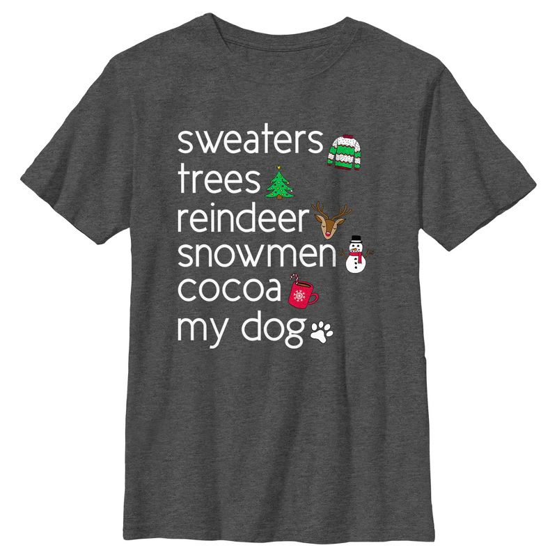 - Strut your stuff with this stylish new Christmas boys' t-shirt that is perfect for the holidays! Featuring a list that reads: "Sweaters Trees Reindeer Snowmen Cocoa My Dog" with icons representing each word.