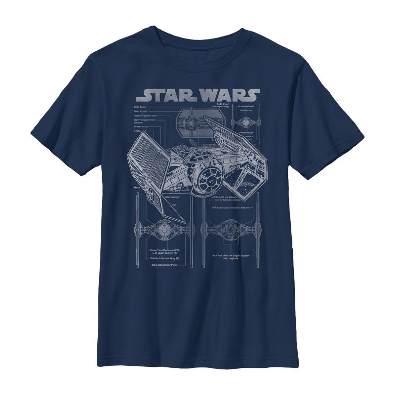 The prototype TIE Advanced x1 made famous by Darth Vader takes centerstage on the Star Wars TIE Fighter Blueprint Boys' T-Shirt. The Star Wars logo is printed at the top of this durable graphic tee, with blueprints of the TIE Fighter and TIE Advanced x1 below.