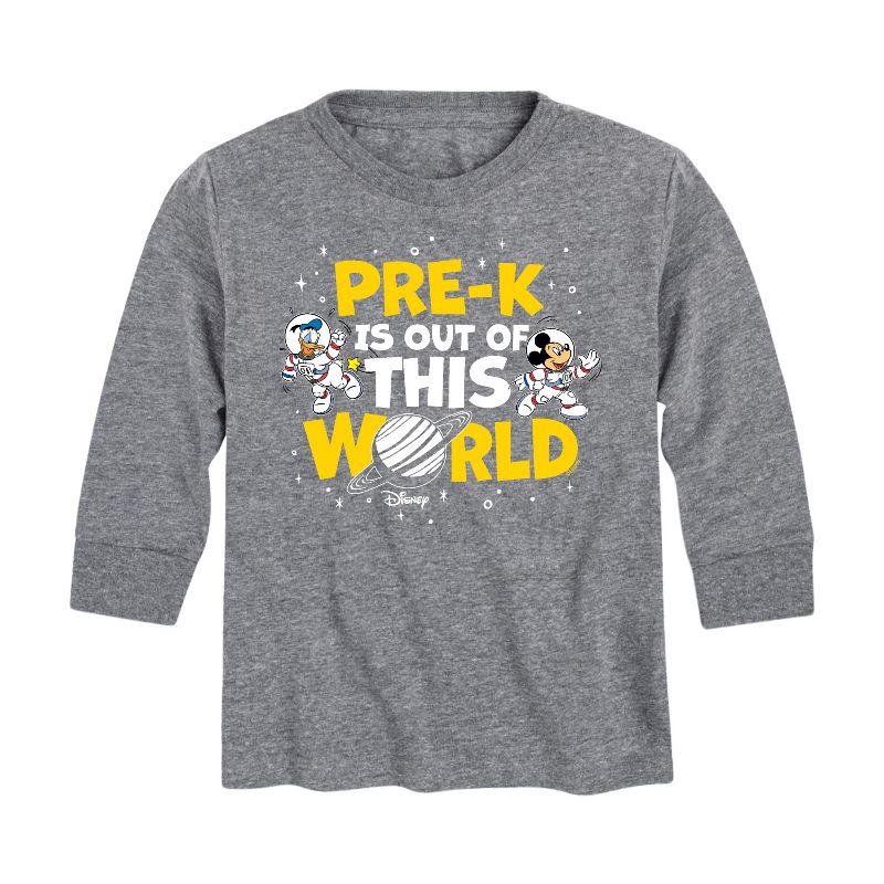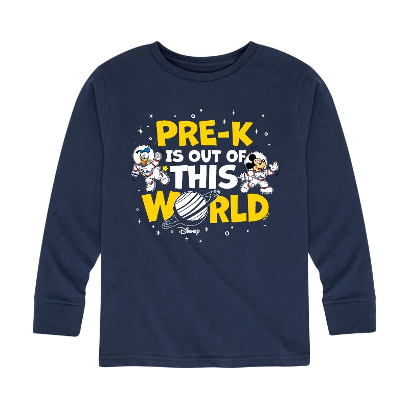 Mickey & Friends - Pre-K Out of This World - Youth Long Sleeve Graphic T-Shirt - Add a touch of magic to your wardrobe with this graphic apparel featuring iconic Disney designs. Showcasing beloved characters and classic imagery, each piece combines nostalgic charm with modern style—perfect for Disney fans of all ages. Whether you're headed to the parks or just adding whimsy to your everyday look, these graphics bring the magic to life.