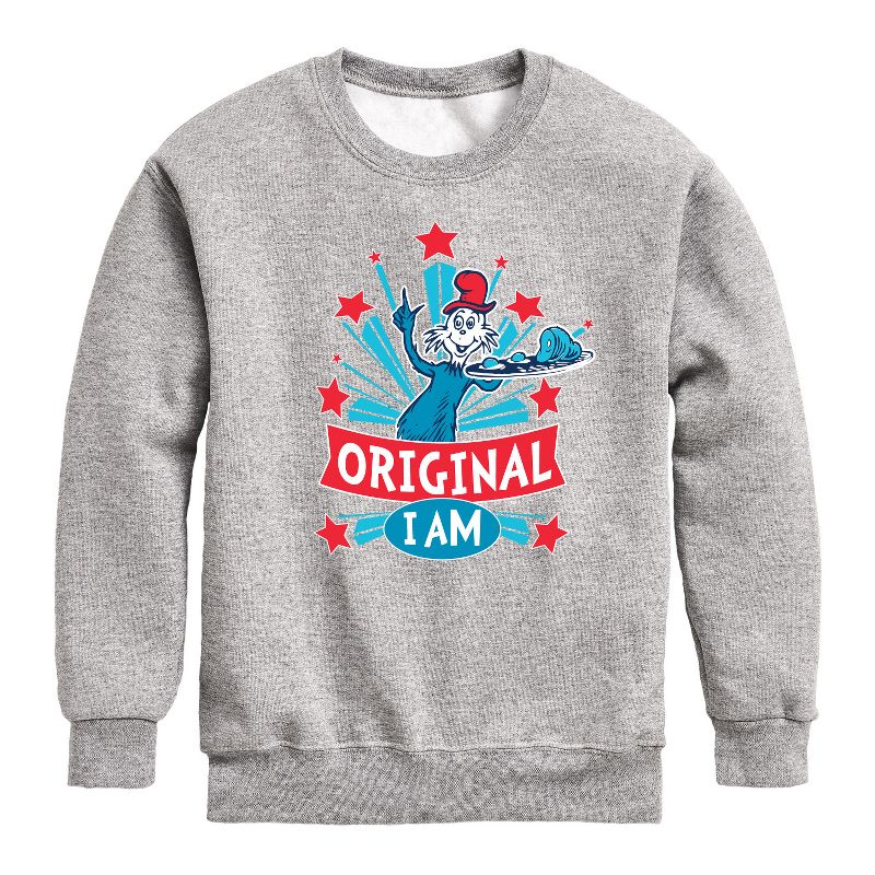 Dr. Seuss - Original I am Green Eggs and Ham - Toddler And Youth Crewneck Fleece Sweatshirt - Our collection of graphic apparel featuring officially licensed Dr. Seuss characters brings the whimsy and wonder of Seussville straight into your wardrobe. From the mischievous Cat in the Hat to the stinky Grinch, each design showcases iconic characters and scenes from Dr. Seuss's timeless stories.
