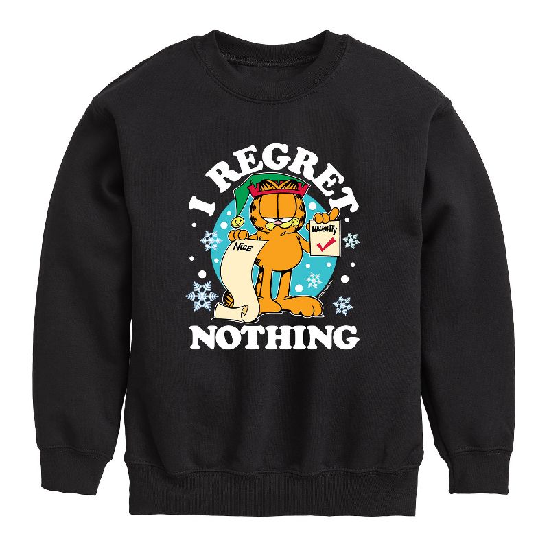Garfield - I Regret Nothing - Toddler And Youth Crewneck Fleece Sweatshirt - Bring the humor and laziness of the famous orange cat to your wardrobe with Garfield graphic apparel. Featuring Garfield, Odie, and Jon, these designs celebrate the iconic comic strip and its beloved characters.