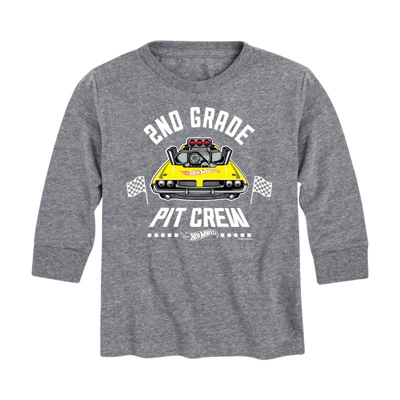 Hot Wheels - Pit Crew 2nd Grade - Youth Long Sleeve Graphic T-Shirt - Speed into bold style with Hot Wheels graphic apparel, featuring high-octane designs that showcase legendary cars like the Twin Mill, Bone Shaker, and other fan favorites. Each piece captures the adrenaline-pumping excitement of epic tracks, jaw-dropping stunts, and non-stop racing action. Perfect for fans of all ages who grew up launching cars off orange tracks and collecting miniature speed machines, this collection brings the thrill of Hot Wheels to your everyday look with energy, nostalgia, and unmistakable style.